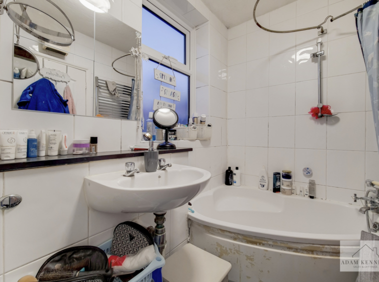 Three piece suite comprising of low flush W.C, pedestal wash hand basin, bath plus shower attachment and mixer taps. Towel rail, extractor fan, fully tiled walls, lino flooring and frosted UPVC double glazed window to rear.