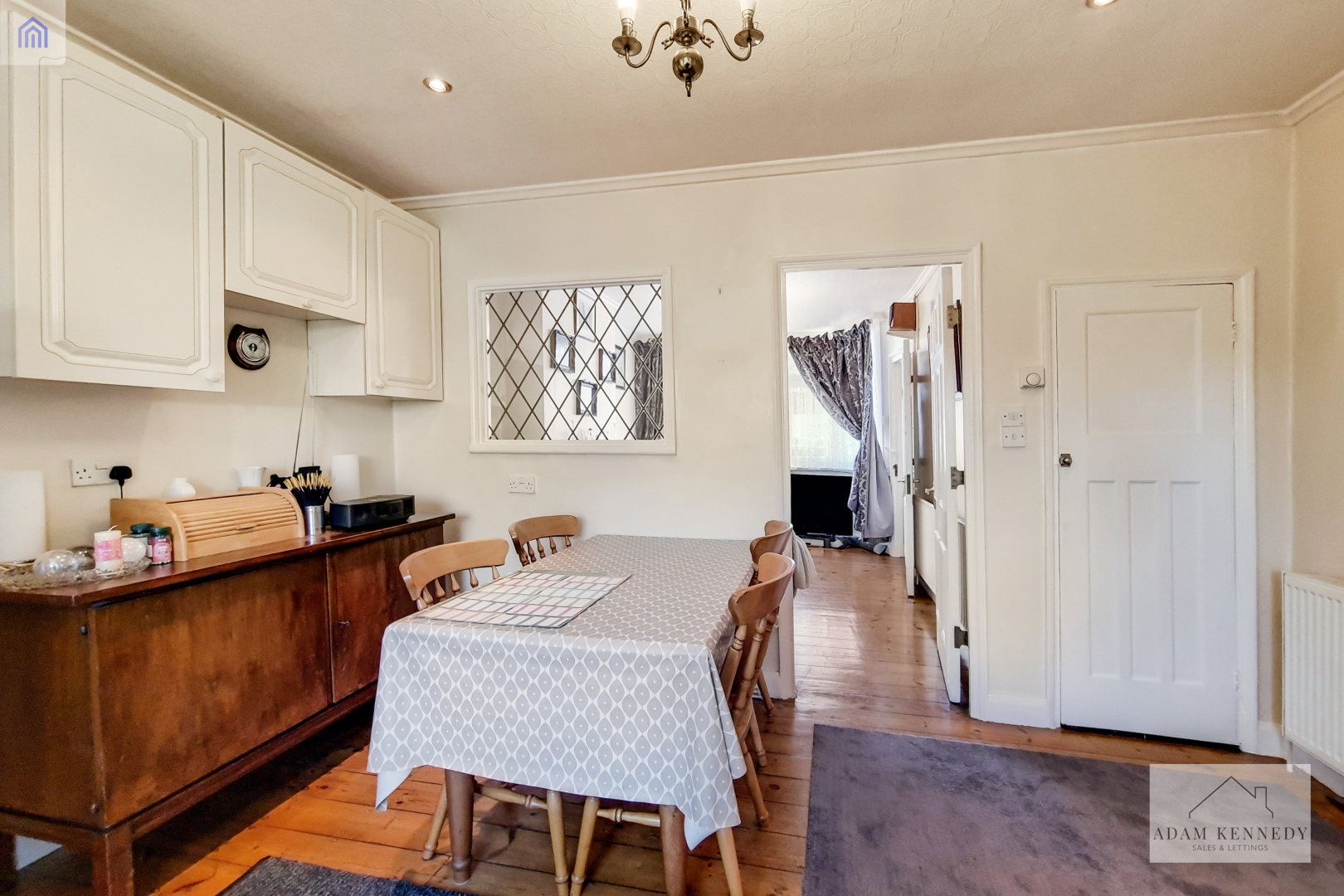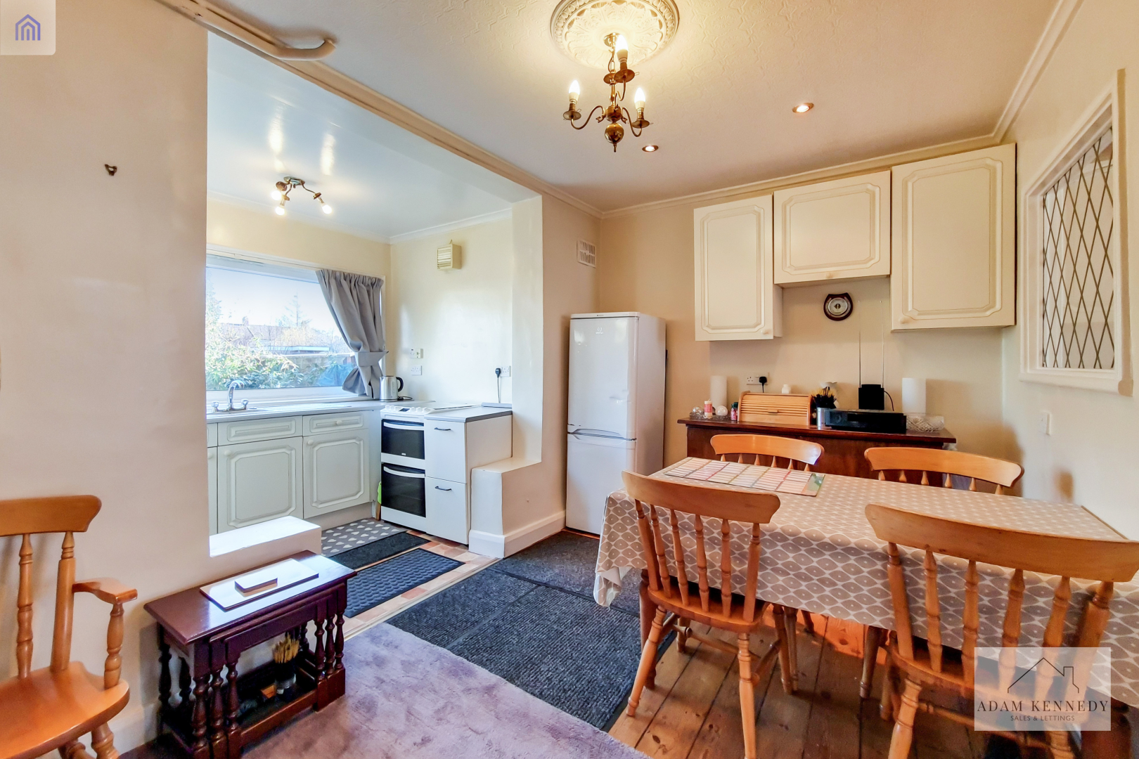 Fitted base units with work top surfaces, stainless steel sink, one bowl, drainer unit and mixer taps. Lino flooring, UPVC double glazed window to rear, power points, door to the garden and an opening to the dining room.