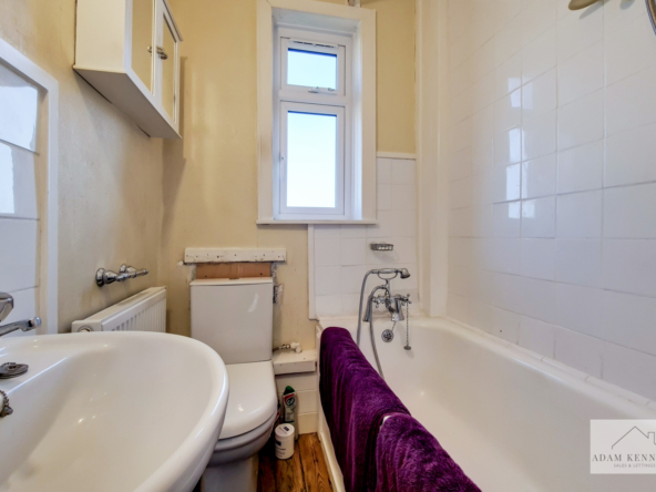 Three piece suite comprising of low flush W.C, pedestal wash hand basin, bath plus shower attachment, mixer taps and electric power shower. Tiled splash backs, wooden laminate flooring and frosted UPVC double glazed window to rear.