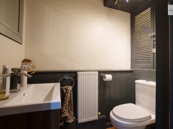 W.C, wash hand basin, half tiled walls, radiator, storage cupboard.