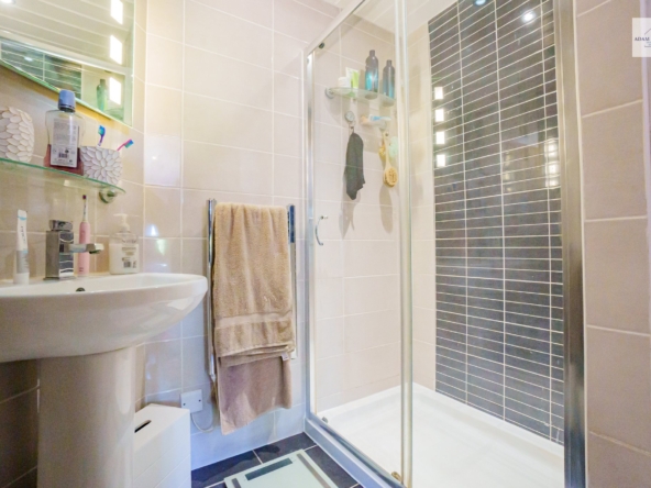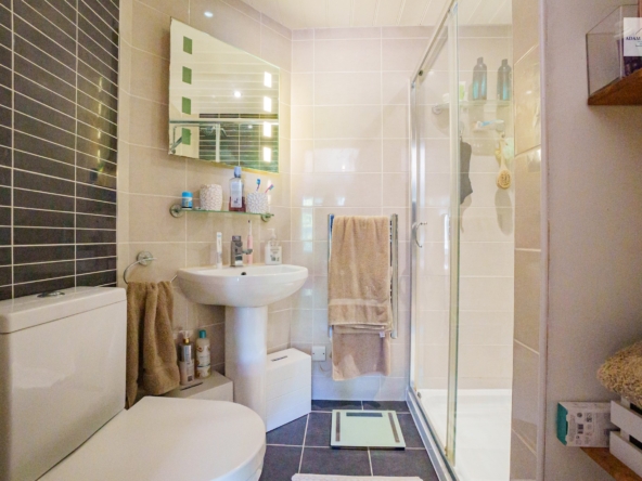 Three piece suite comprising of W.C, wash hand basin and walk in shower, heated towel rail, fully tiled walls, tiled flooring.