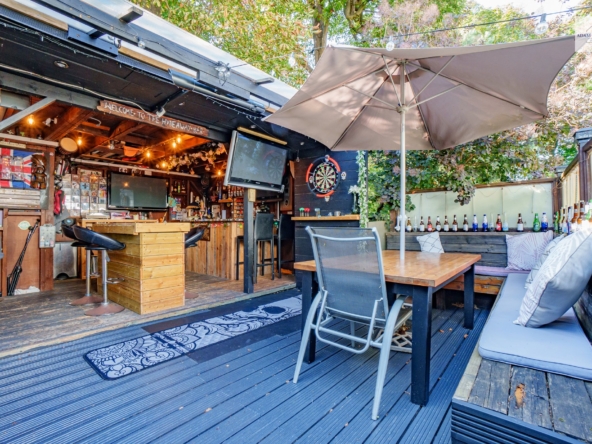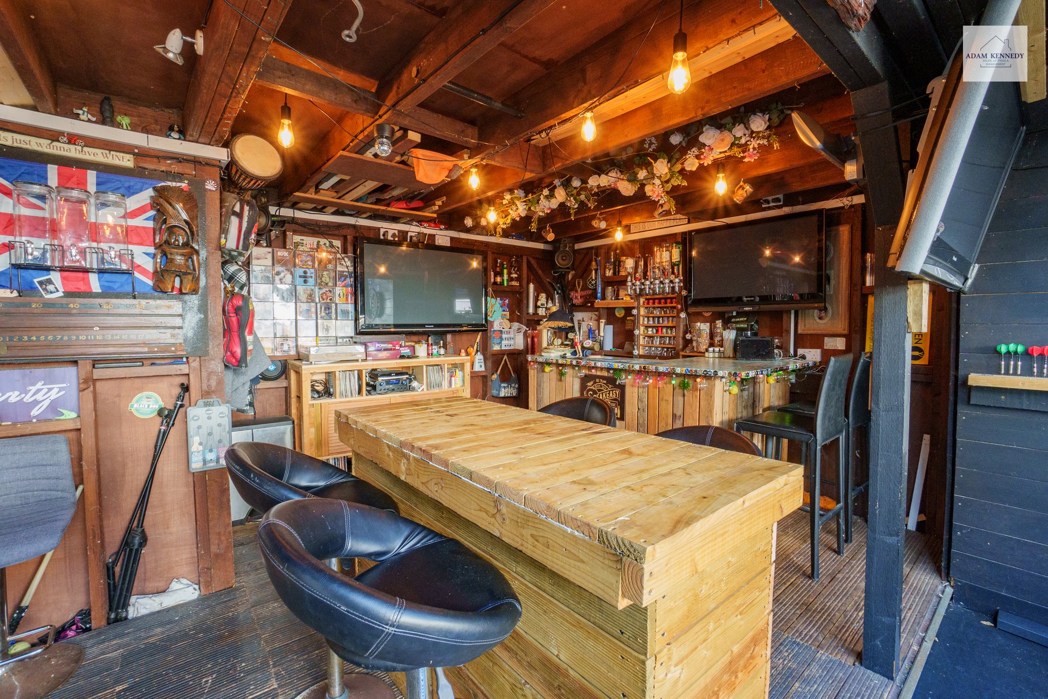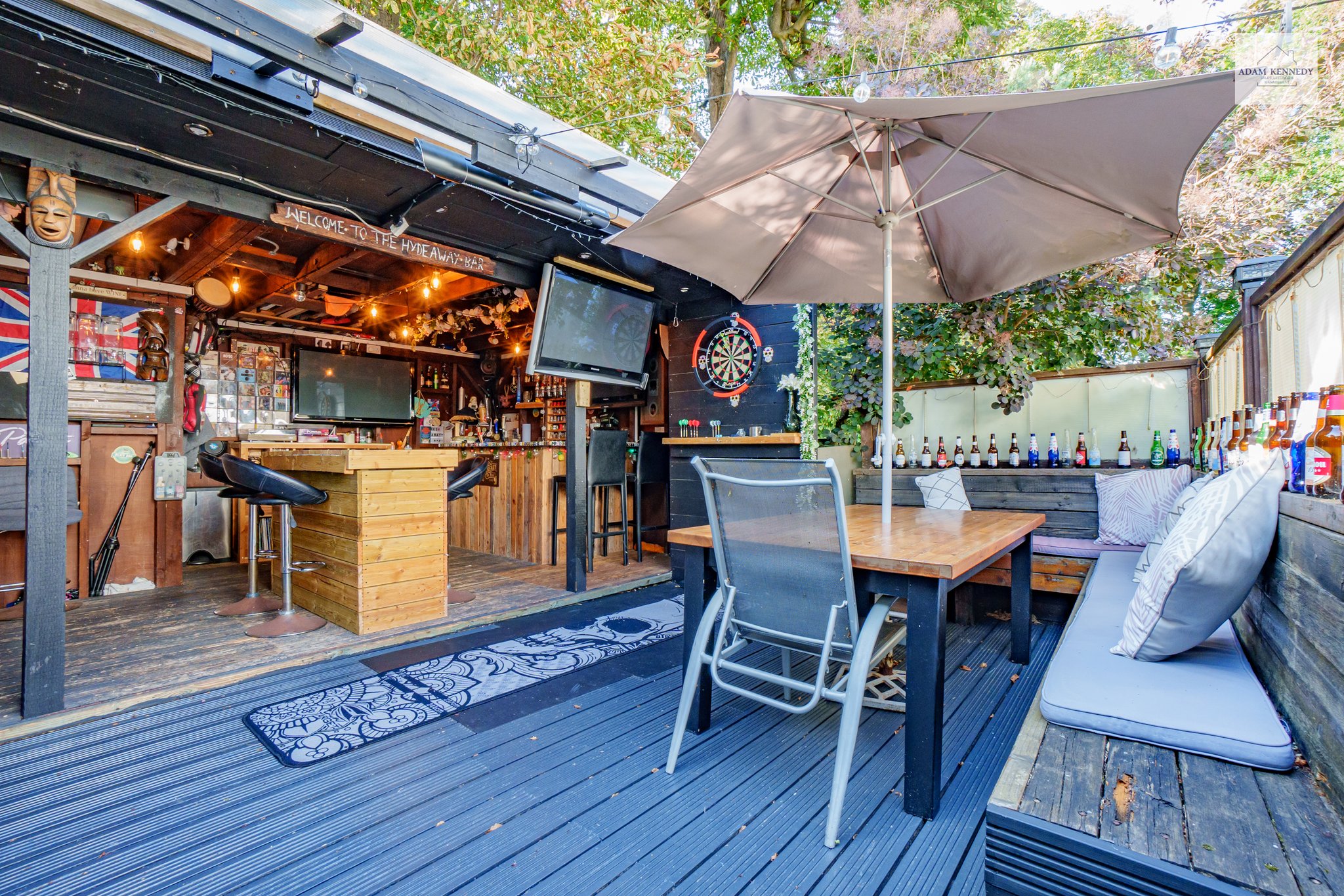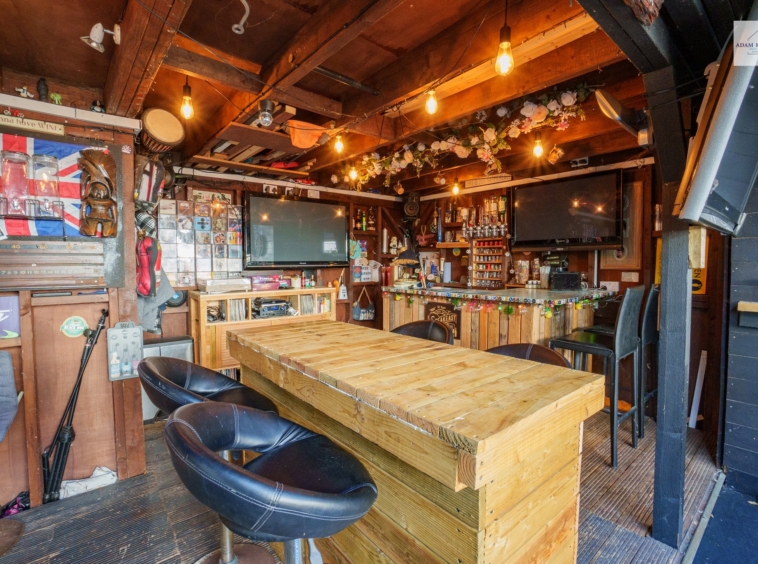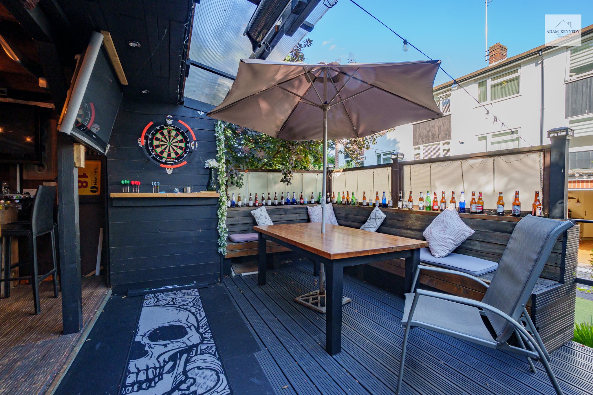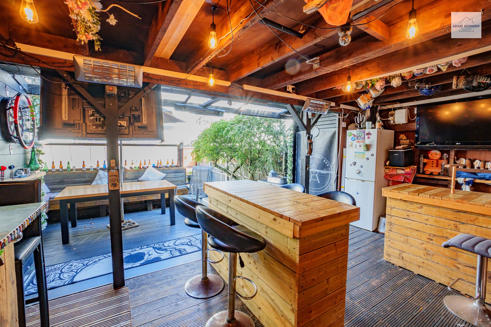 UPVC Bi-fold doors lead you to a pristine garden, with laid lawn, decking and chairs, allowing for much needed relaxation. A couple of steps further lead you to a private bar area. This is perfect for days off or to entertain guests. The bar is a one of a kind gem and sets this property out from the rest and has its own rustic charm to it.