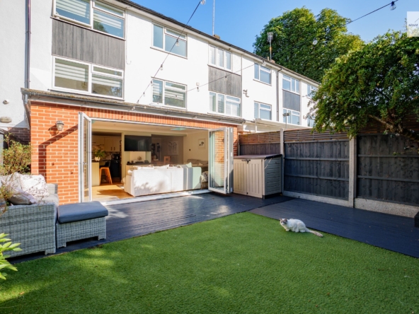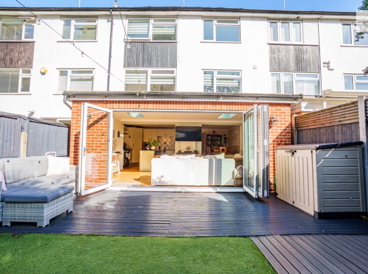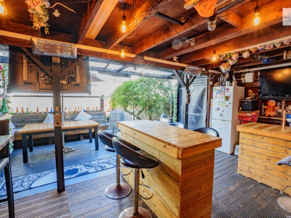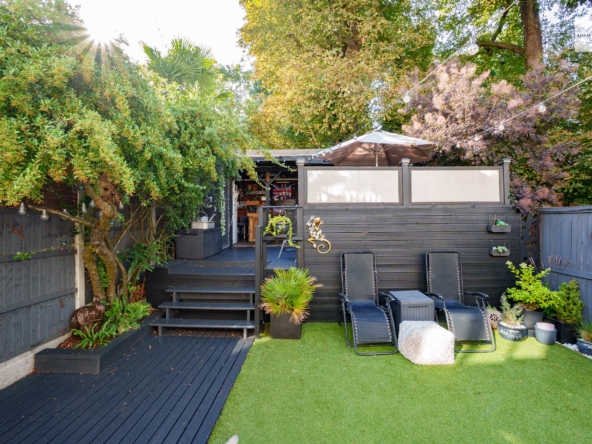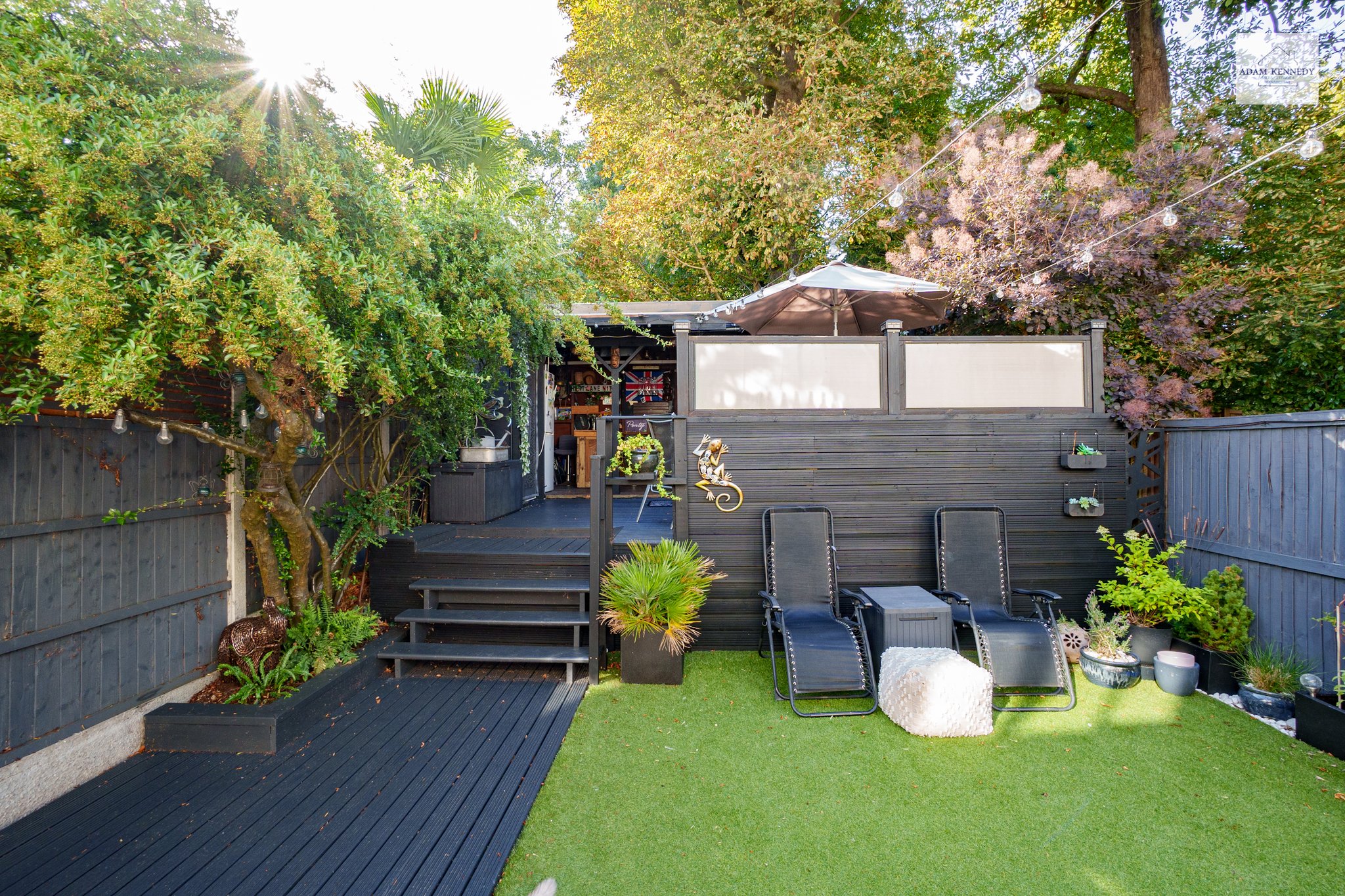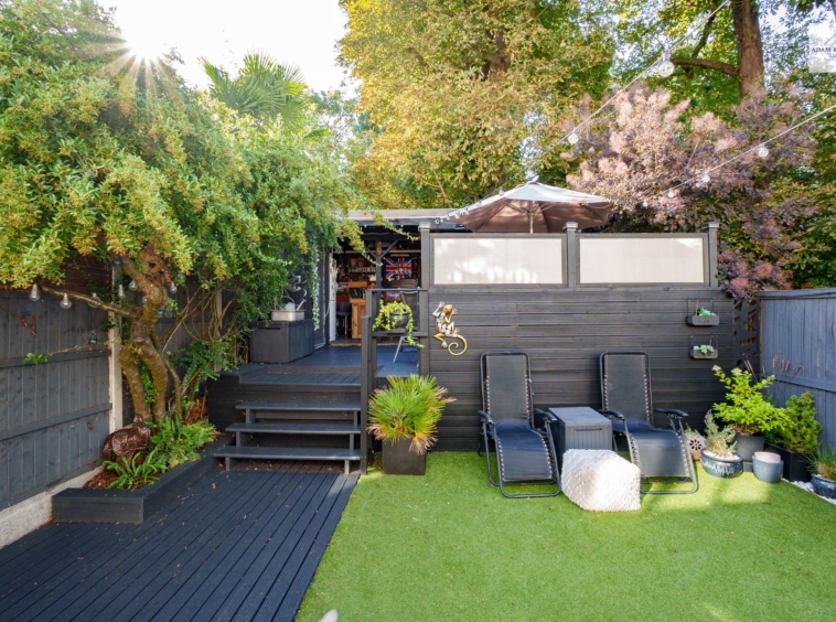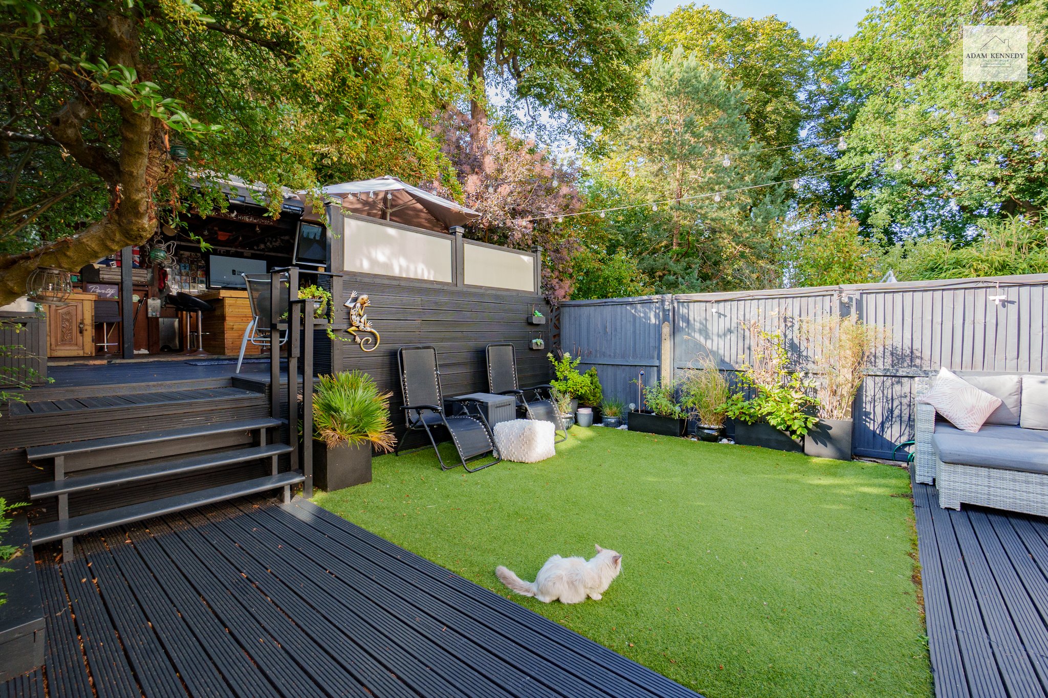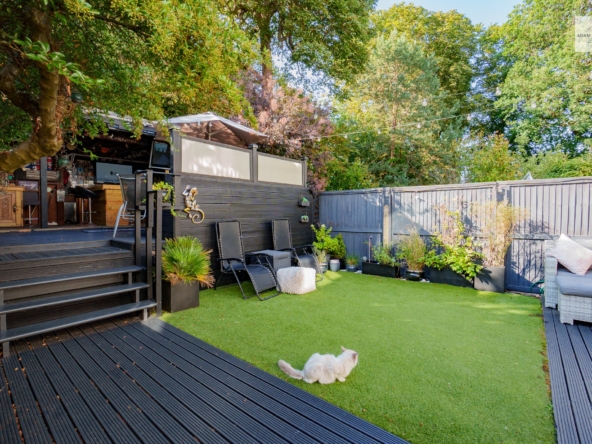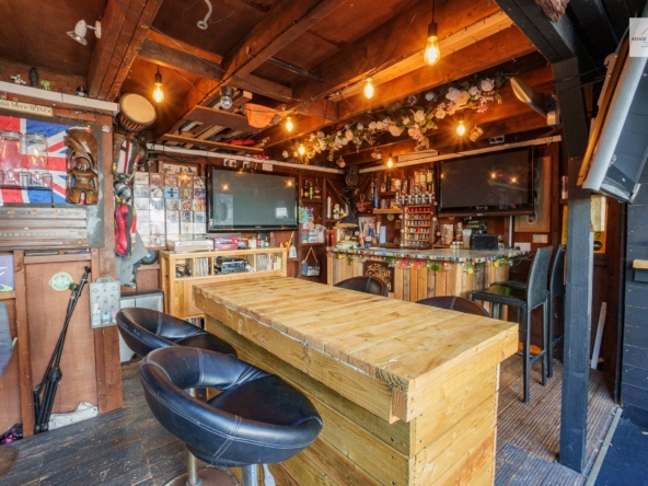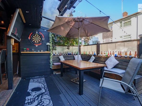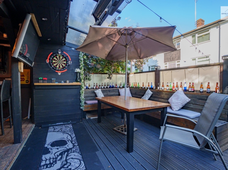 UPVC Bi-fold doors lead you to a pristine garden, with laid lawn, decking and chairs, allowing for much needed relaxation. A couple of steps further lead you to a private bar area. This is perfect for days off or to entertain guests. The bar is a one of a kind gem and sets this property out from the rest and has its own rustic charm to it.