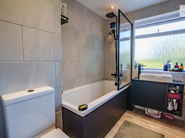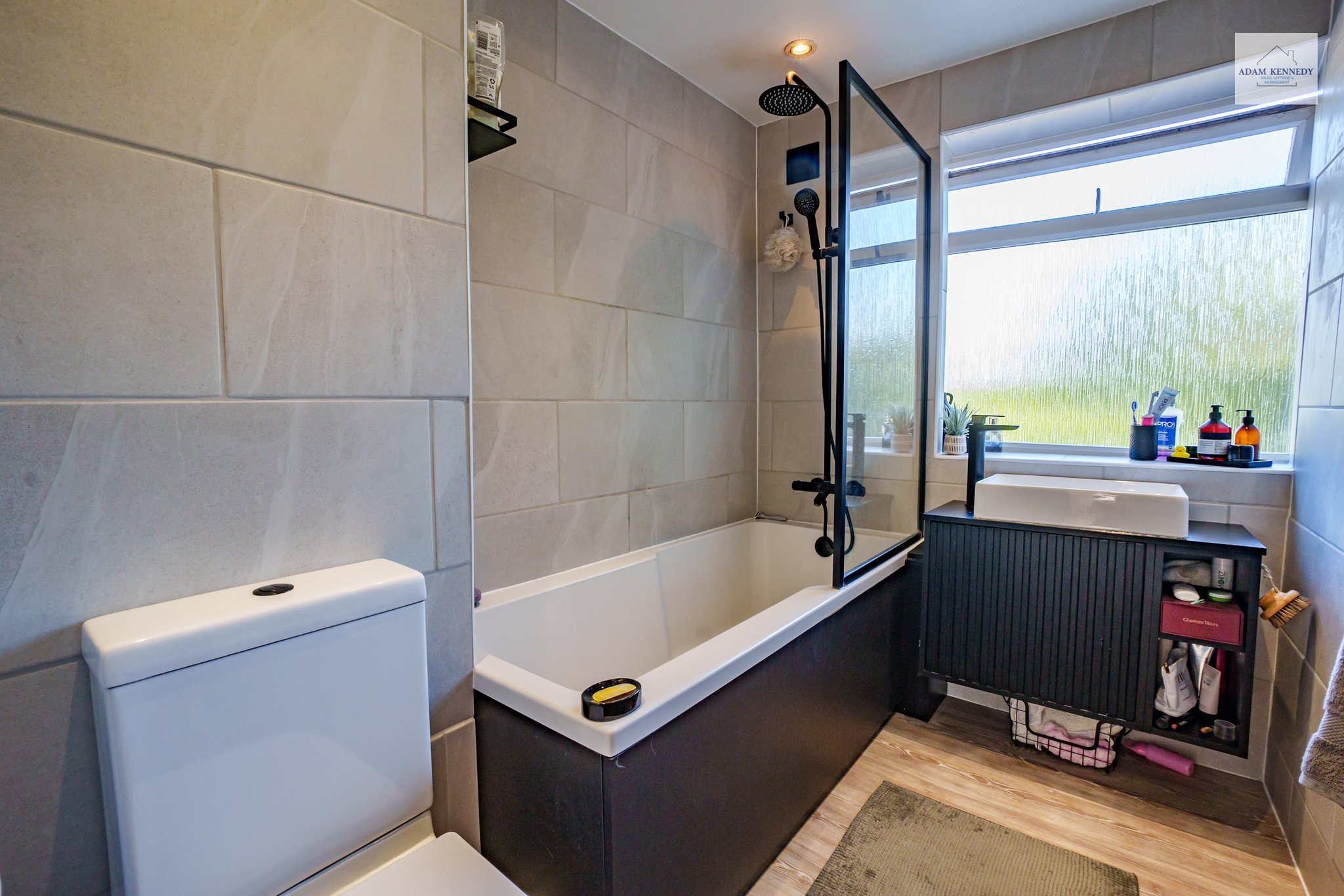 Three piece bathroom suite, W.C, vanity wash hand basin, bath plus shower attachment, chrome towel rail, fully tiled walls, frosted UPVC Double Glazed window to front aspect, storage cupboard.