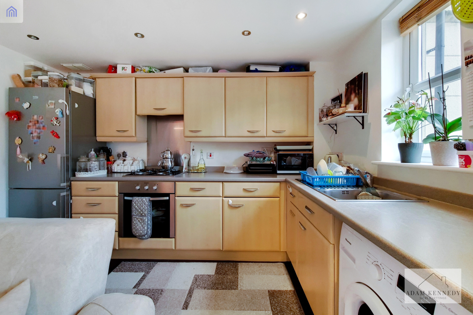 Fitted wall and base units with work top surfaces. Stainless steel sink, one bowl, drainer unit and lever mixer taps. Built in gas hob, electric oven, electric extractor hood and plumbing for washing machine. Lino flooring, UPVC double glazed window to side, one radiator and power points.