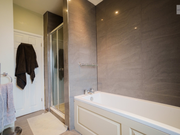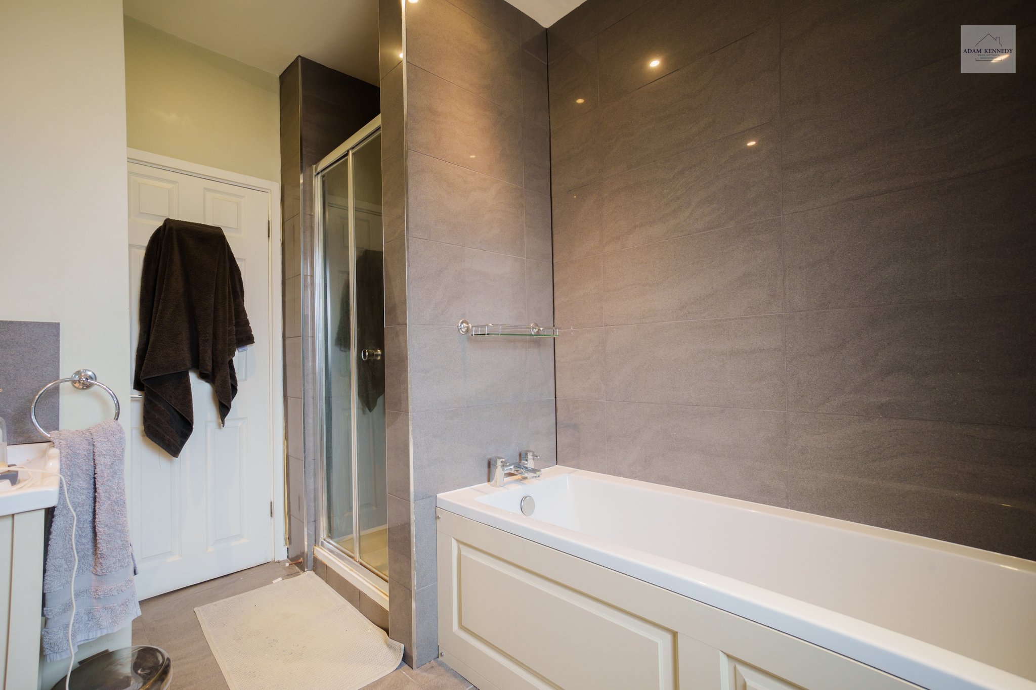 Four piece suite comprising of low flush W.C, panel bath, shower cubical, wash hand basin, tiled flooring throughout, half tiled walls, frosted doubled glazed window to rear aspect.