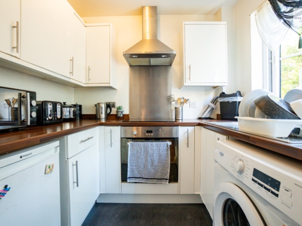 UPVC Double Glazed window to side aspect, stainless steel sink, built in electric hob, built in electric oven, electric extractor hood, fitted wall and base units with work top surfaces, washing machine, power points.