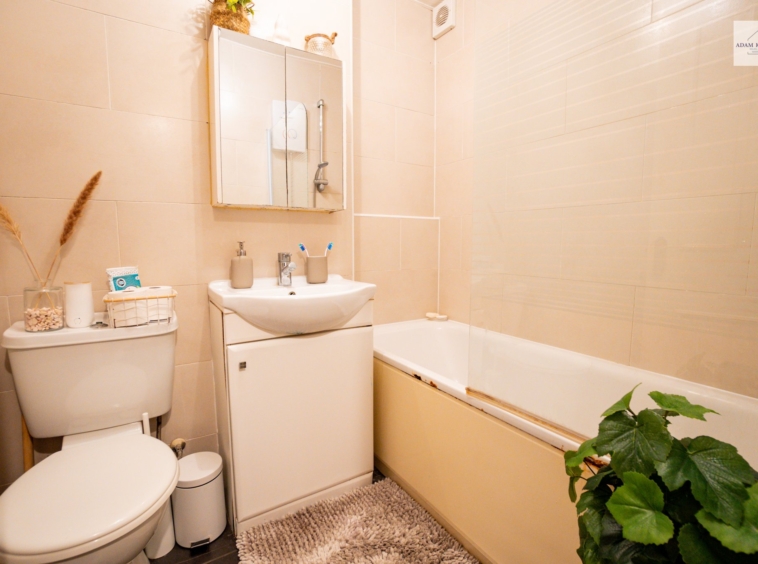 3 Piece suite comprising of low flush W.C, vanity wash hand basin, bath plus shower attachment, fully tiled walls, storage cupboard.