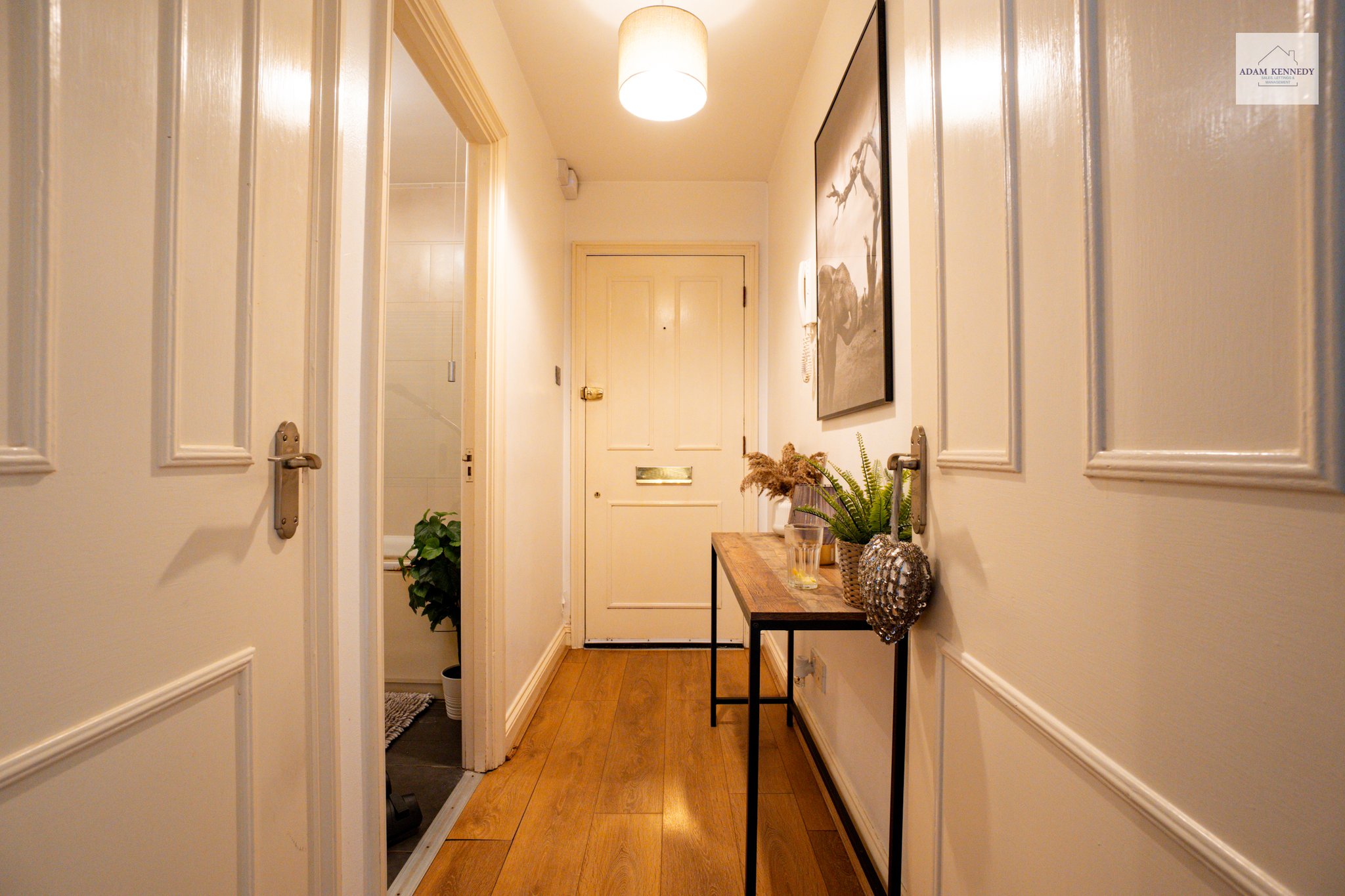 Front door, laminate flooring, door to bathroom on side aspect, door to reception, power points.