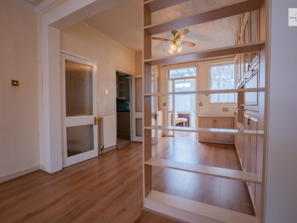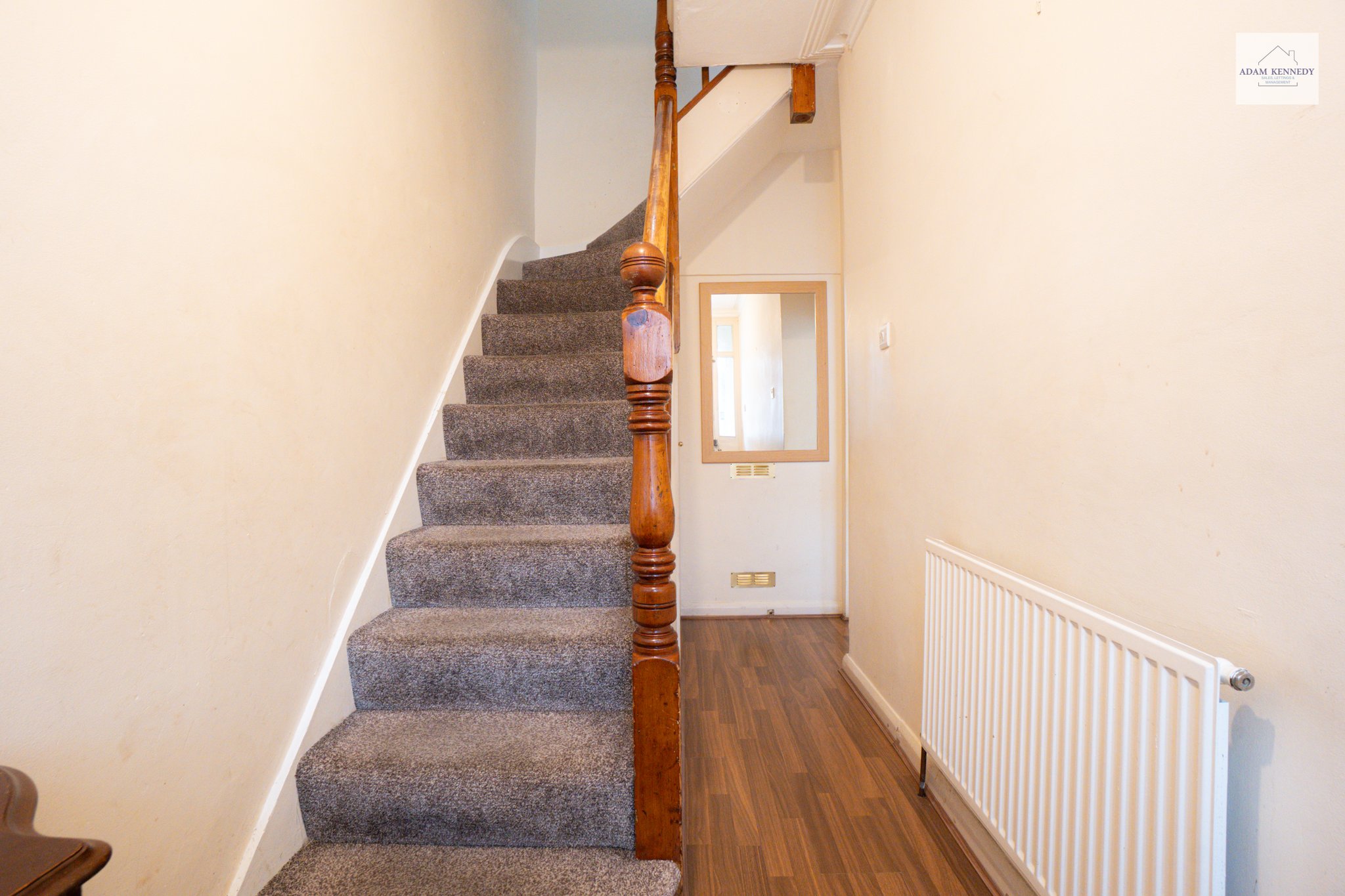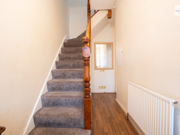 Door leading into hallway, stairs leading to first floor, gas radiator to side aspect, laminate flooring throughout, door leading into through lounge.