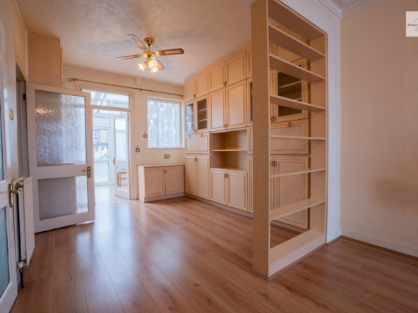 Through lounge, laminate throughout, UPVC Double Glazed bay window, fireplace to side aspect, gas radiator under bay window, door to kitchen on side aspect, door to conservatory. built in storage units and power points throughout.