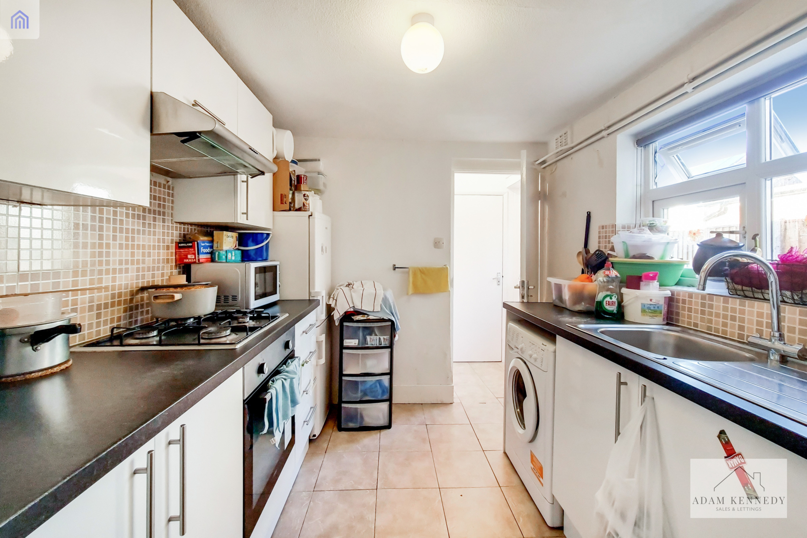 Fitted wall and base units with work top surfaces, stainless steel sink, one bowl, drainer unit and mixer taps. Built in gas hob, electric oven and electric extractor fan. Plumbing for washing machine, tiled splash backs, tiled flooring, UPVC double glazed window to side, power points, door to the rear hallway and sliding door to the hallway.