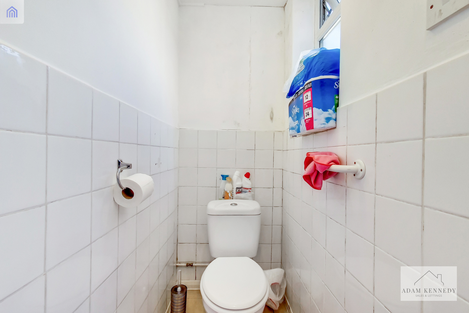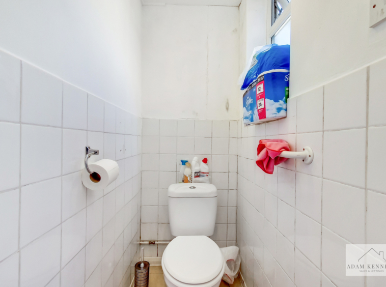 Low flush W.C, 1/2 tiled walls, tiled flooring and frosted UPVC double glazed window to side.