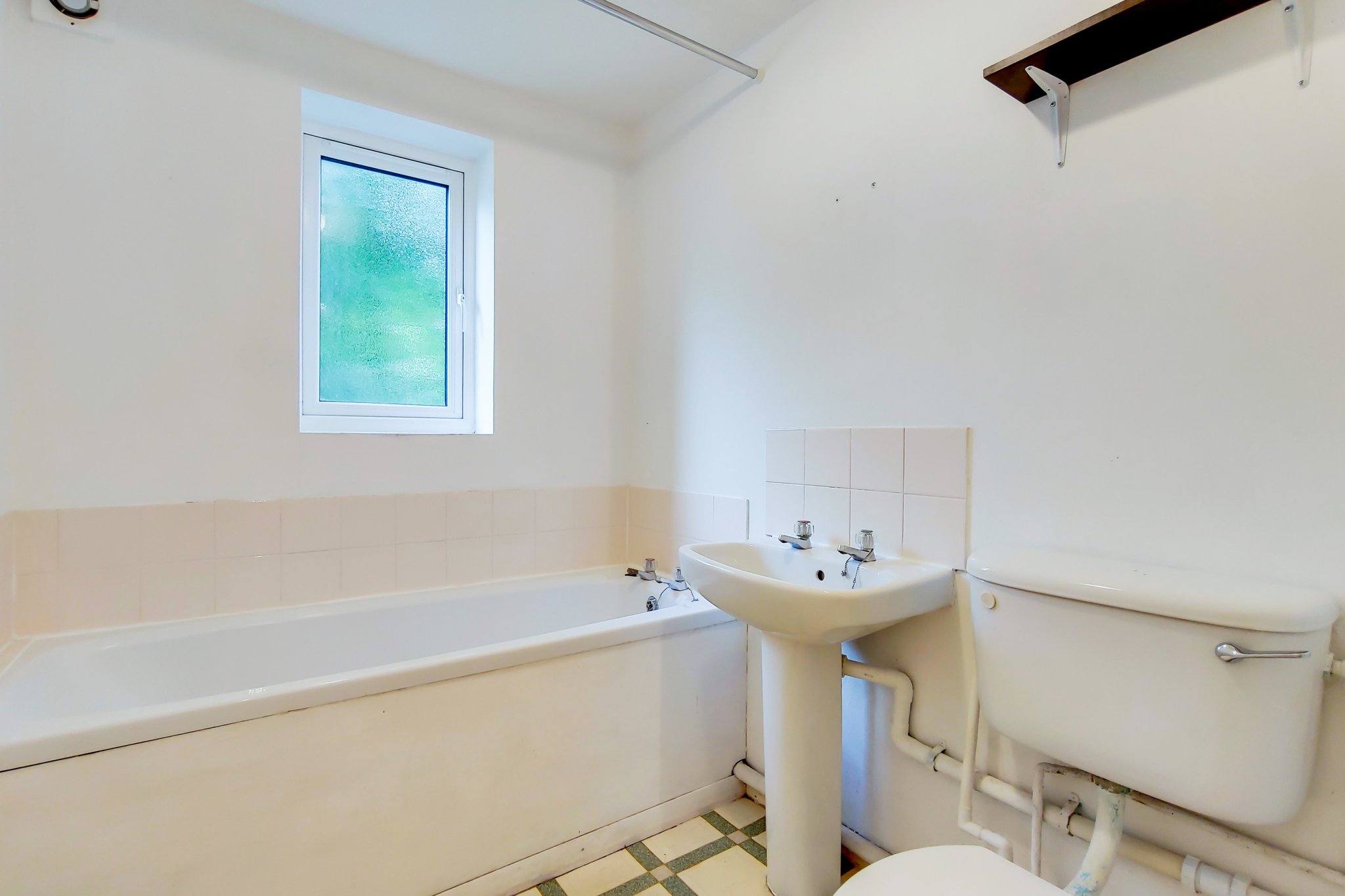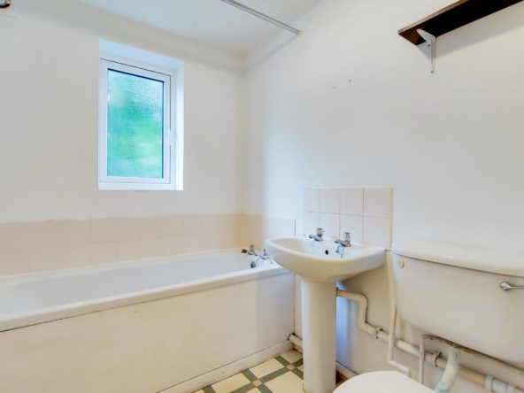 3 Piece, low flush W.C, pedestal wash hand basin, panel bath, mixer taps, extractor fan, lino flooring, frosted UPVC double glazing and window to rear.