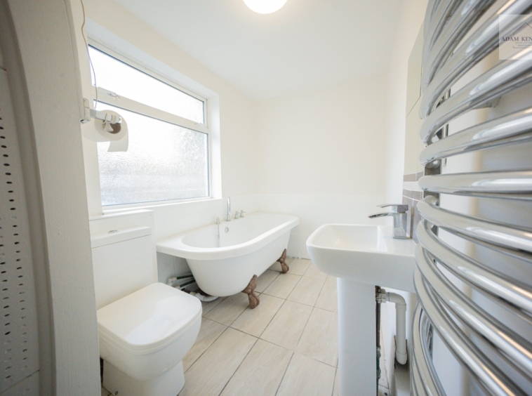 Three piece suite comprising of low flush w.c, wash hand basin, bath tub, radiator, window to rear aspect.