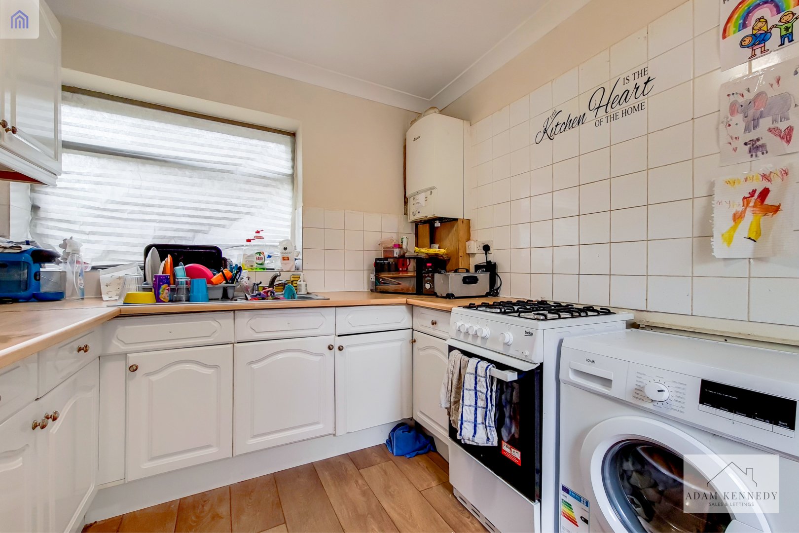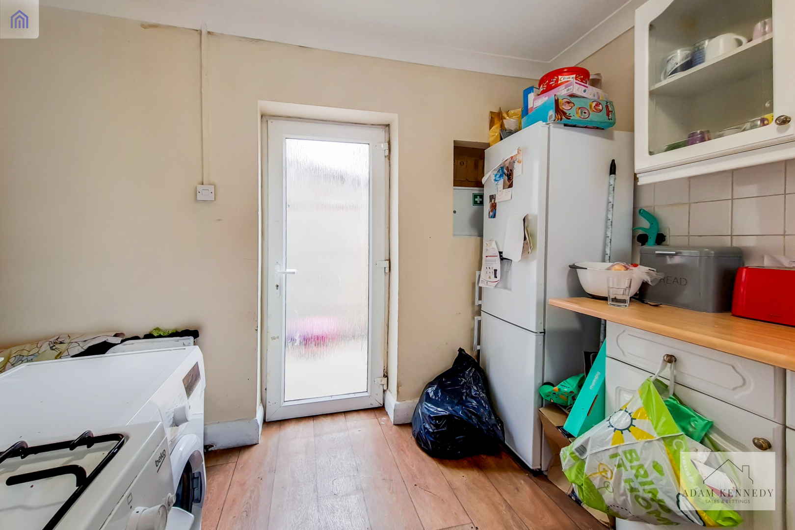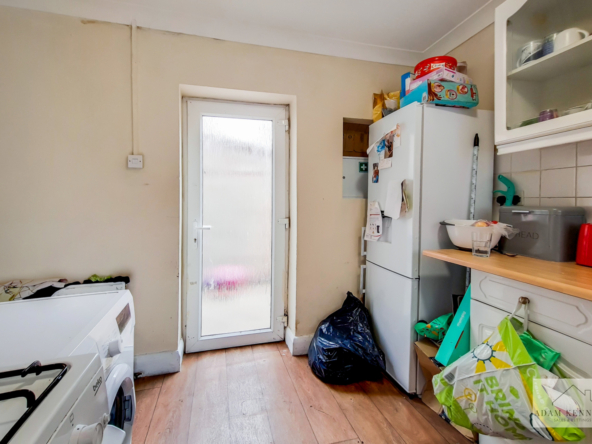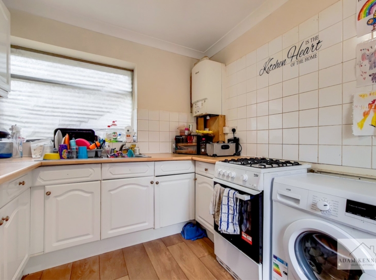 Fitted wall and base units with work top surfaces, stainless steel sink, one bowl, drainer unit and mixer taps. Freestanding gas hob and oven. Plumbing for washing machine, tiled splash backs, laminate flooring, UPVC double glazed window to side, one radiator, power points and doors to the reception and garden.