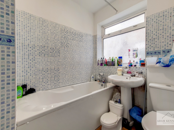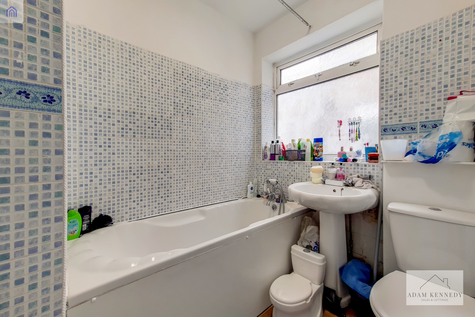 Three piece suite comprising of low flush W.C, pedestal wash hand basin, bath plus shower attachment and mixer taps. Extractor fan, one radiator, 1/2 tiled walls and frosted UPVC double glazed window to side.